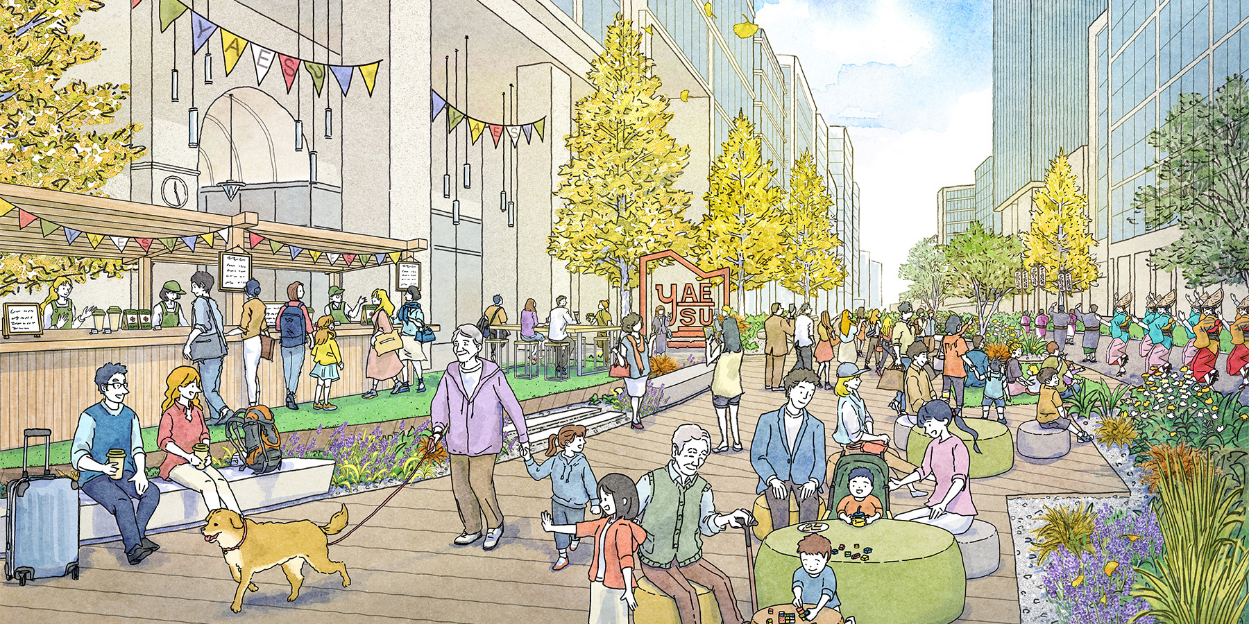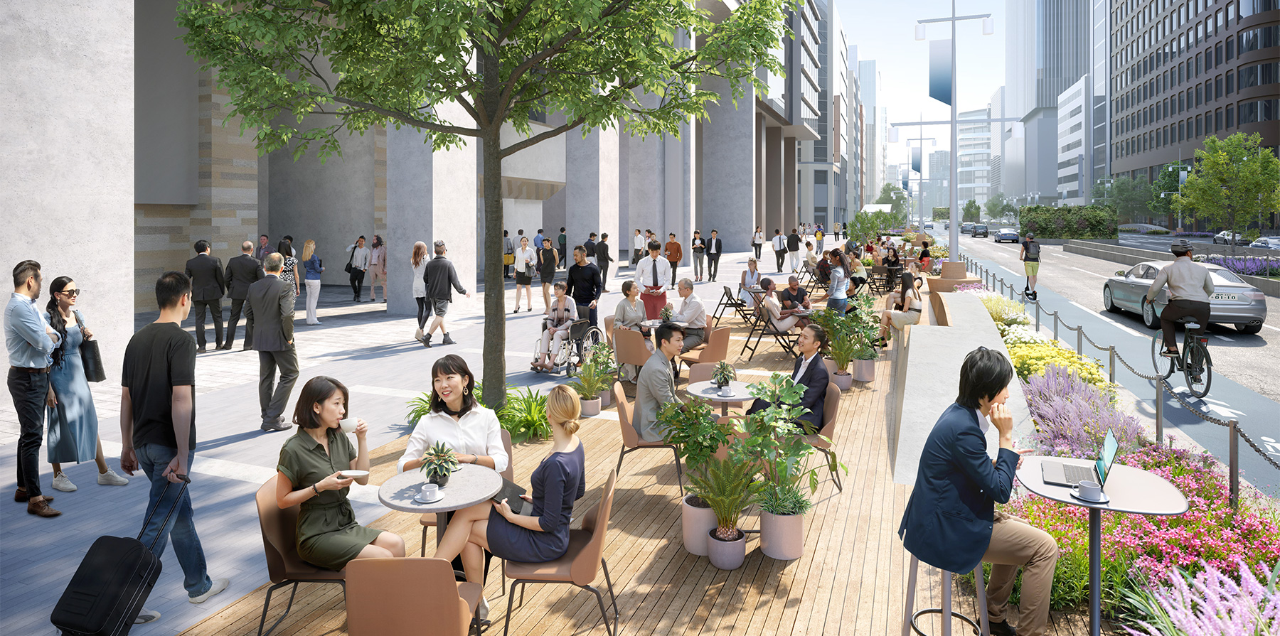 また、基本方針に基づき、八重洲通りでの展開を期待する理想的なアクティビティのシーンを描きます。