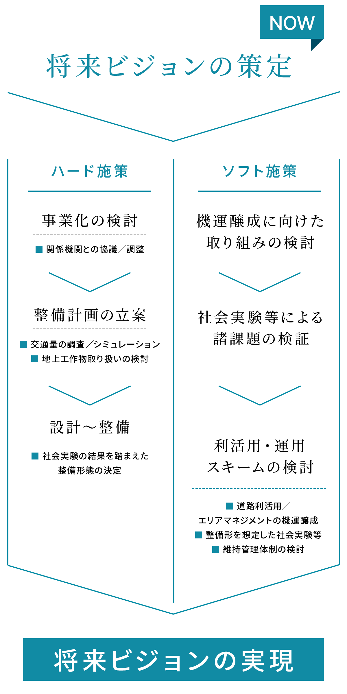 本ビジョンを実現するためには、今後ハードとソフトの両面で検討を進めていく必要があります。本ビジョンをたたき台として、地元住民や関係機関と協議を行いながら、随時、内容のアップデートを行っていきます。